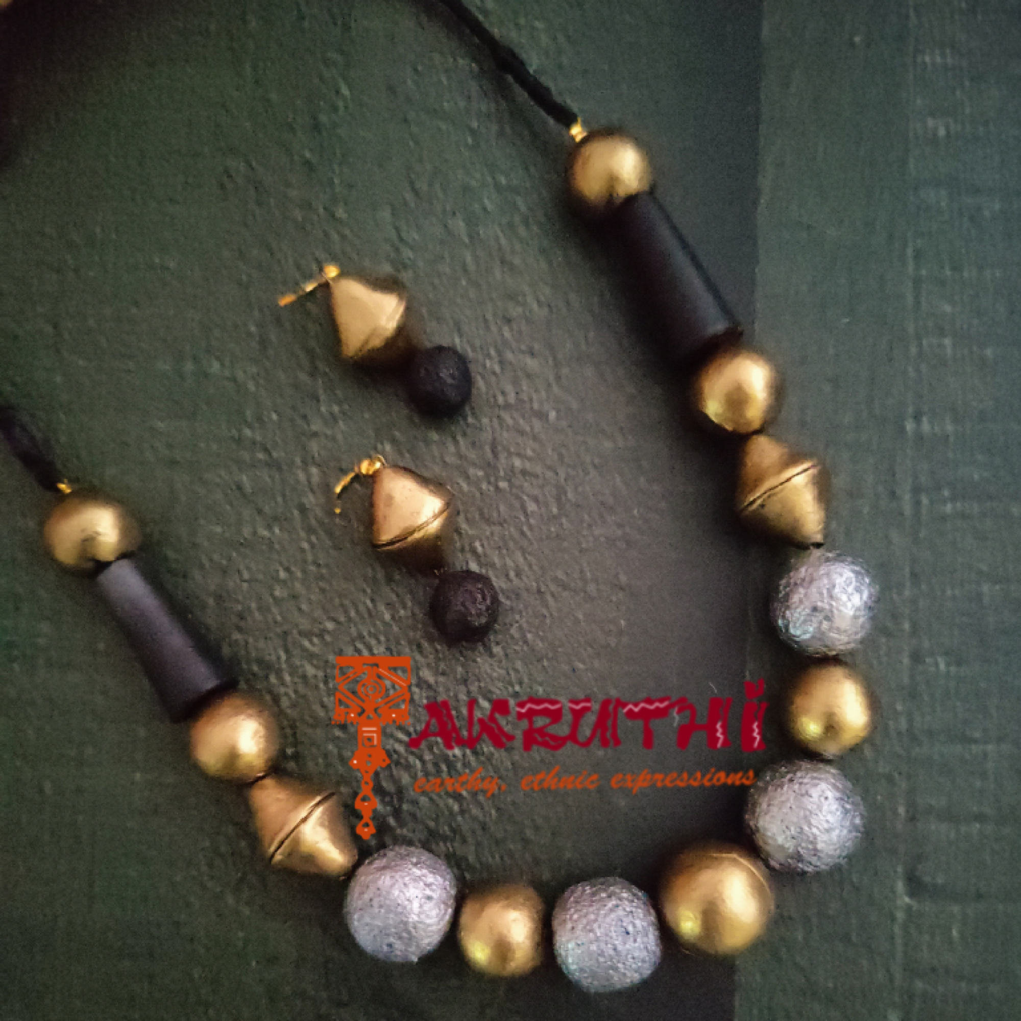 Introducing our beautiful handmade terracotta necklace, expertly crafted by skilled artisans and perfect for any occasion. This necklace is a stunning fusion of gold and silver colours, adding a touch of elegance to any outfit.